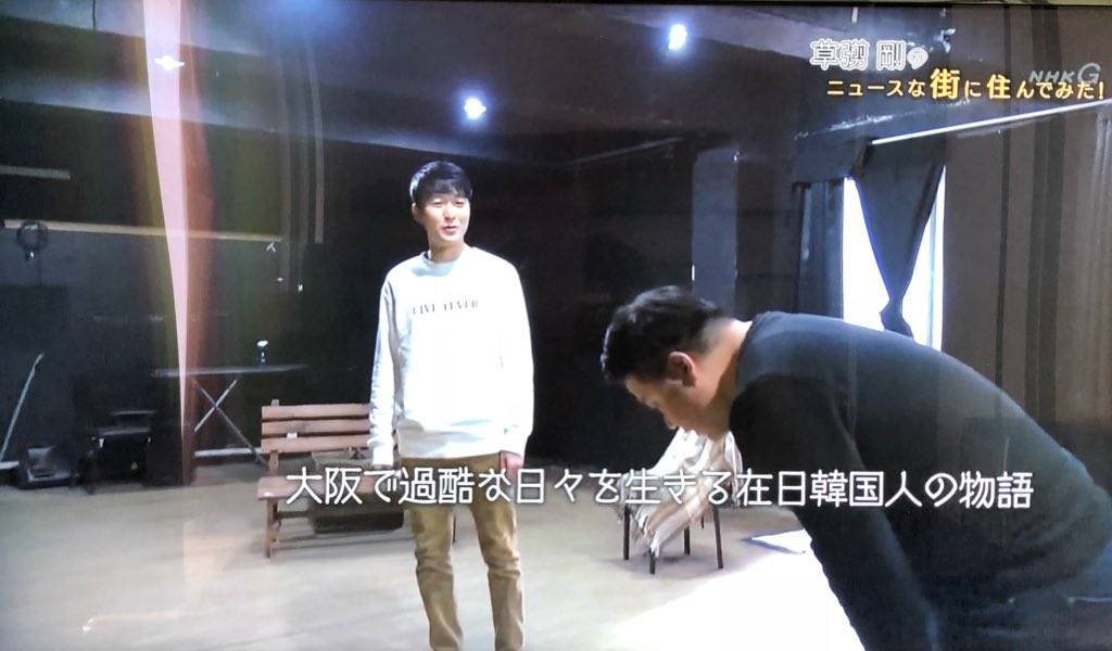私も観てみました。NHKのドキュメンタリーなんですけど、仕込み感が半端なかったです。草彅が歩いてると声をかけてきた人が「ファンです、近くで舞台の稽古してるんですが見ませんか」と来て、見たら大阪に住む在日韓国人の過酷な生活を日本語劇舞台。で、戦争の話に。最初から訴えたいことが丸見え。